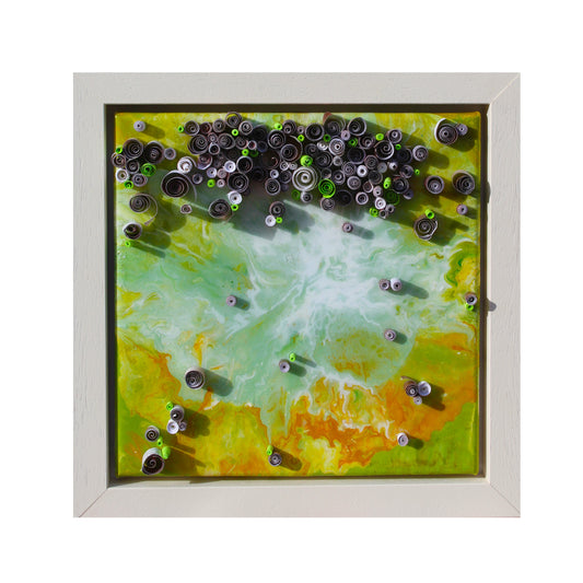 "Cloud Burst" -20.32cm(L) x 20.32cm(H) Framed Wall Hanging with Green Hues and Quilling.
