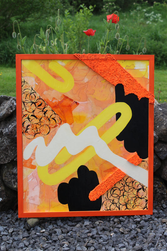 "Orange Discourse" -66.5cm(L)x56.0cm(H) Framed Wall Hanging with Acrylic Pour, Spray paint and Quilling